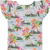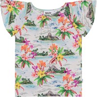 T-shirt med rundskåret korte ærmer i økologisk bomuld. T-shirten har et alloverprint af øde øer, palmestrande og Hawaii blomster i friske farver. T-shirten har en rund halsudskæring der rynker fortil.