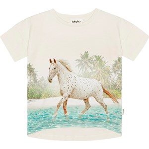 Hvid økologisk bomulds t-shirt med påsyet ærmer. T-shirten har en god pasform og går længere ned bagpå. På fronten er der et print af en hest på en Bounty strand.
