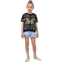 Sort t-shirt i blød, økologisk bomuld med rund hals og t-shirtærmer, der falder let over skuldrene. T-shirten har en løs pasform, er længere bagtil og med et farverigt blomster-print.