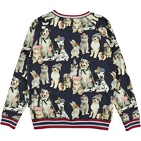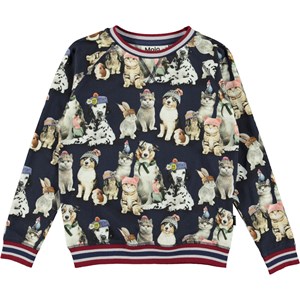 Raewyn er en mørkeblå bluse med lange ærmer og all-over print af forskellige kæledyr med hue og pandebånd på. Raewyn har stribet ribkant ved hals, ærmeafslutning og bund, som passer til farven på printet.