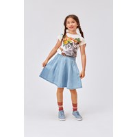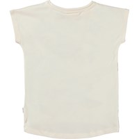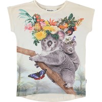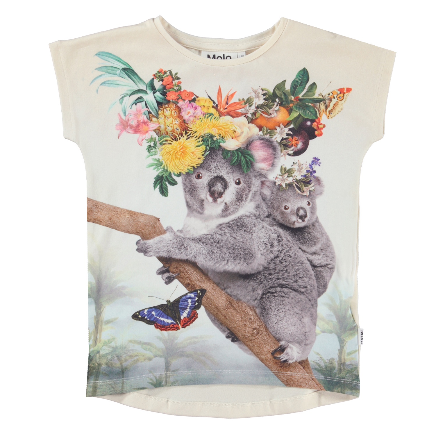Ragnhilde er en råhvid t-shirt i økologisk bomuld. Ragnhilde har en dropped hem på bagsiden og på forsiden ses printet Fruitastic, hvor en koala mor og baby er klar til fest med flotte tropiske blomtser og frugter i håret.