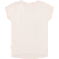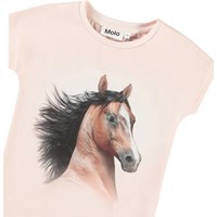 Strækbar lyserød t-shirt i økologisk bomuld. T-shirten har en almindelig pasform, små korte ærmer, ribkant ved halsen og går længere ned bagpå end foran. T-shirten har et frontprint af en brun hest i vinden.