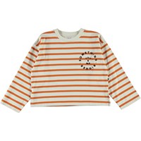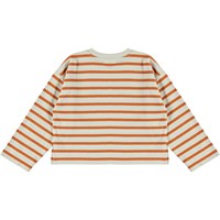 Rainis er en langærmet bluse med orange breton striber. Rainis har slidser i siden og tryk på venstre bryst.
