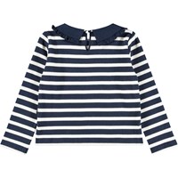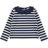 Blå og hvidstribet langærmet bluse i økologisk bomuld med en krave der lukkes med en knap i nakken. Blusen har en løs pasform og har en lille slids i hver side.