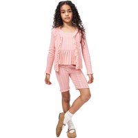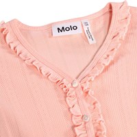 Ferskenfarvet cardigan i blød, finstrikket bomuldsjersey med diskret hulmønster. Modellen har lange ærmer, V-udskæring og små knapper foran. Langs udskæring, knaplukning og kanter er der fine flæsedetaljer, som giver et romantisk og legende udtryk.