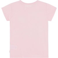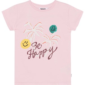 Lyserød kortærmet t-shirt i økologisk bomuld med to små paillet-broderier af smilende ansigter, palme-print og teksten 'Be Happy'. T-shirten har rund halsudskæring og en almindelig pasform.