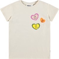 Råhvid kortærmet t-shirt i økologisk bomuld med rund hals. T-shirten har en almindelig pasform med pailletbroderi af smilende hjerter på brystet.