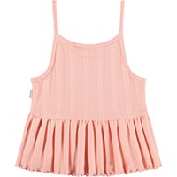 Koralfarvet, ærmeløs top i økologisk bomuld med smalle stropper. Toppen har et diskret hulmønster og afsluttes med en bred, plisseret flæsekant, der skaber et let og legende look.