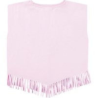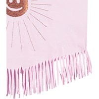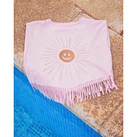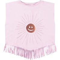 Lyserød oversize top i økologisk bomuld med ribkant i halsen og frynser i bunden. Toppen har en sol på forsiden, broderet med en glitrende kobbertråd.
