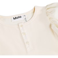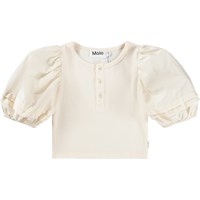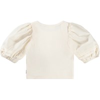 Råhvid cropped t-shirt i blød, økologisk bomuld med rund hals og tre knapper foran. T-shirten har en tætsiddende pasform med pufærmer i fast bomuld, som giver et stilfuldt udtryk.