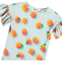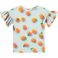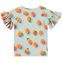 Lyseblå økologisk bomulds t-shirt med rund hals og flæseærmer. T-shirten har en almindelig pasform og et allover print af solmodne abrikoser.