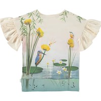 Rayah er en top i økologisk bomuld. Rayah har et dropped sleeve med en flæse i bunden, der giver et frit og legende look. Toppen har placement printet Morning Dew Pond, hvor man kan se to tropiske fugle sidde på vandoverfladen på dammen. Under vandet ses de små haletudser.