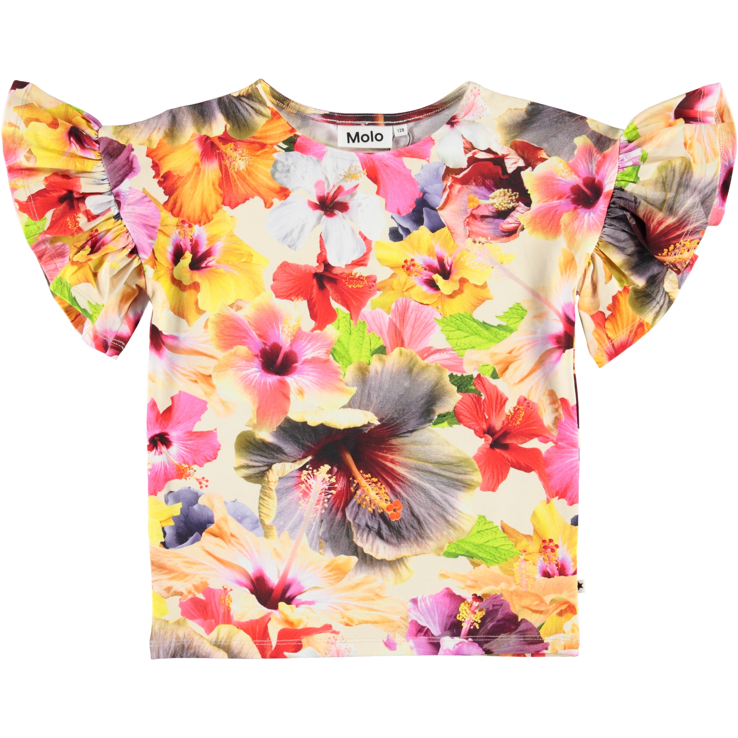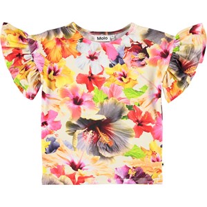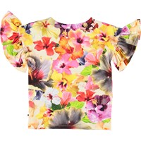 Blomsterne springer ud i flotte farver her i printet 'Pacific Floral' på t-shirten Rayah. Rayah har korte ærmer med flæser.