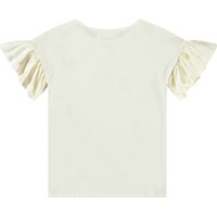 Hvid økologisk bomulds t-shirt med rund hals og flæseærmer. T-shirten har en almindelig pasform og et farverigt frontprint af to forelskede papegøjer med en frodig jungle som baggrund.