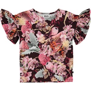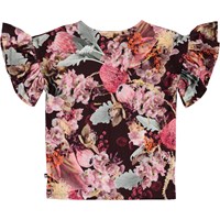 Blomster printet træder utroligt flot frem i boardeuax og rosa toner her på t-shirten Rayah. T-shirten har korte ærmer med flæsekant.