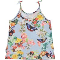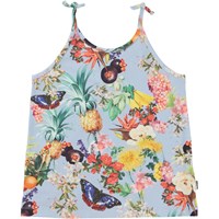 Reba er en lyseblå top i økologisk bomuld. Toppen har stropper, som er bundet med en knude som en cool detalje. Reba er printet i allover printet Tropical Fruits, hvor man kan se ranker af tropiske frugter, tropiske blomster og sommerfugle.