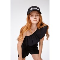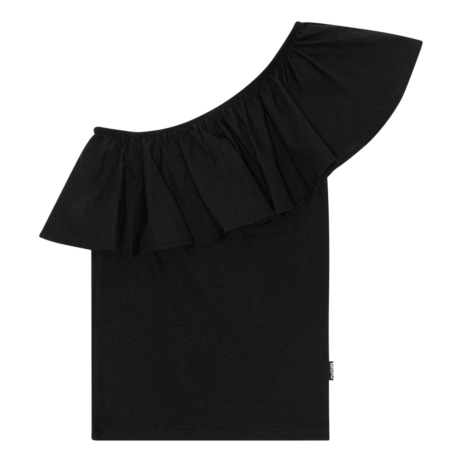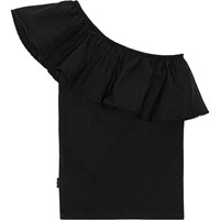 Sort one-shoulder top i økologisk bomuld med stretch. Toppen har en tætsiddende pasform og en bred poplin flæse langs halsudskæringen.