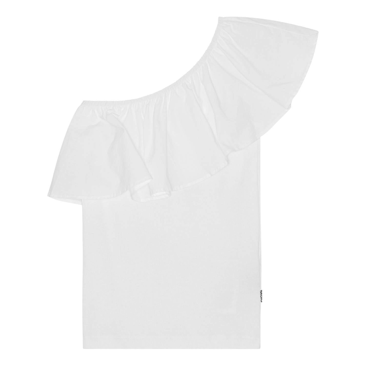 Hvid one-shoulder top i økologisk bomuld med stretch. Toppen har en tætsiddende pasform og en bred poplin flæse langs halsudskæringen.