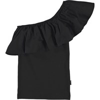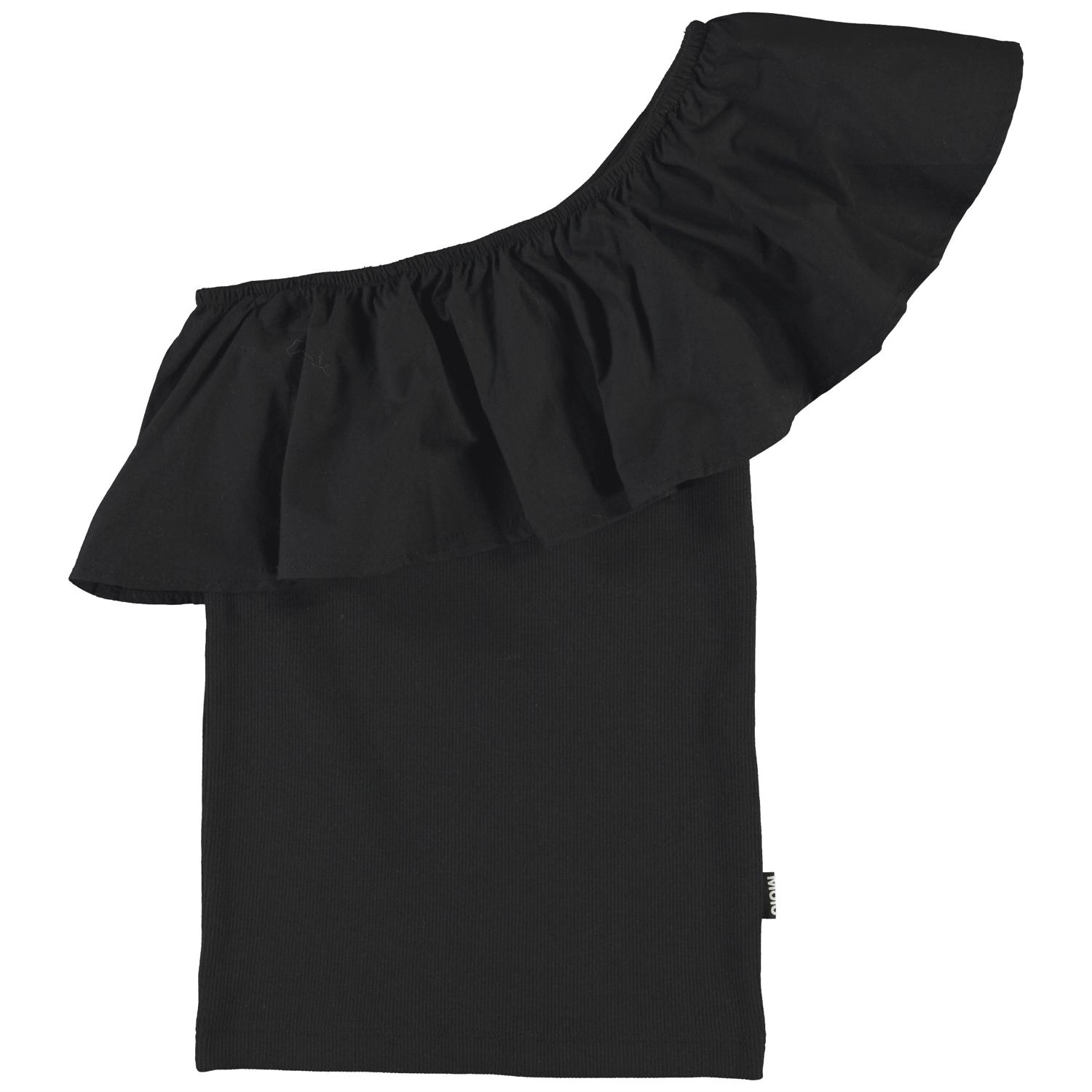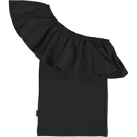 Rebecca er en sort asymetrisk top med skrå flæsekant. Certificeret af Ecocert Greenlife, certifikationsnr. 197496.