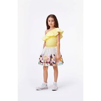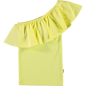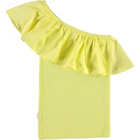 Rebecca er en gul asymetrisk top med skrå flæsekant. Certificeret af Ecocert Greenlife, certifikationsnr. 197496.