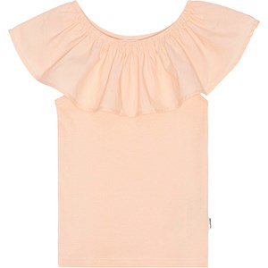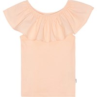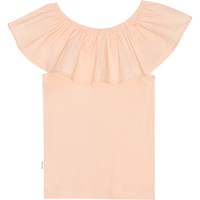 Ferskenfarvet off shoulder-top uden ærmer i blødt økologisk bomuld med stretch. Toppen har en bred flæsekant i poplin langs den elastiske halsudskæring, der gør, at kraven også kan bæres over skuldrene.
