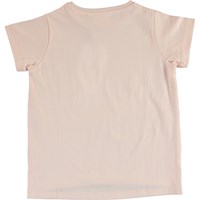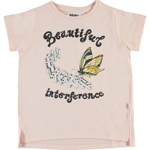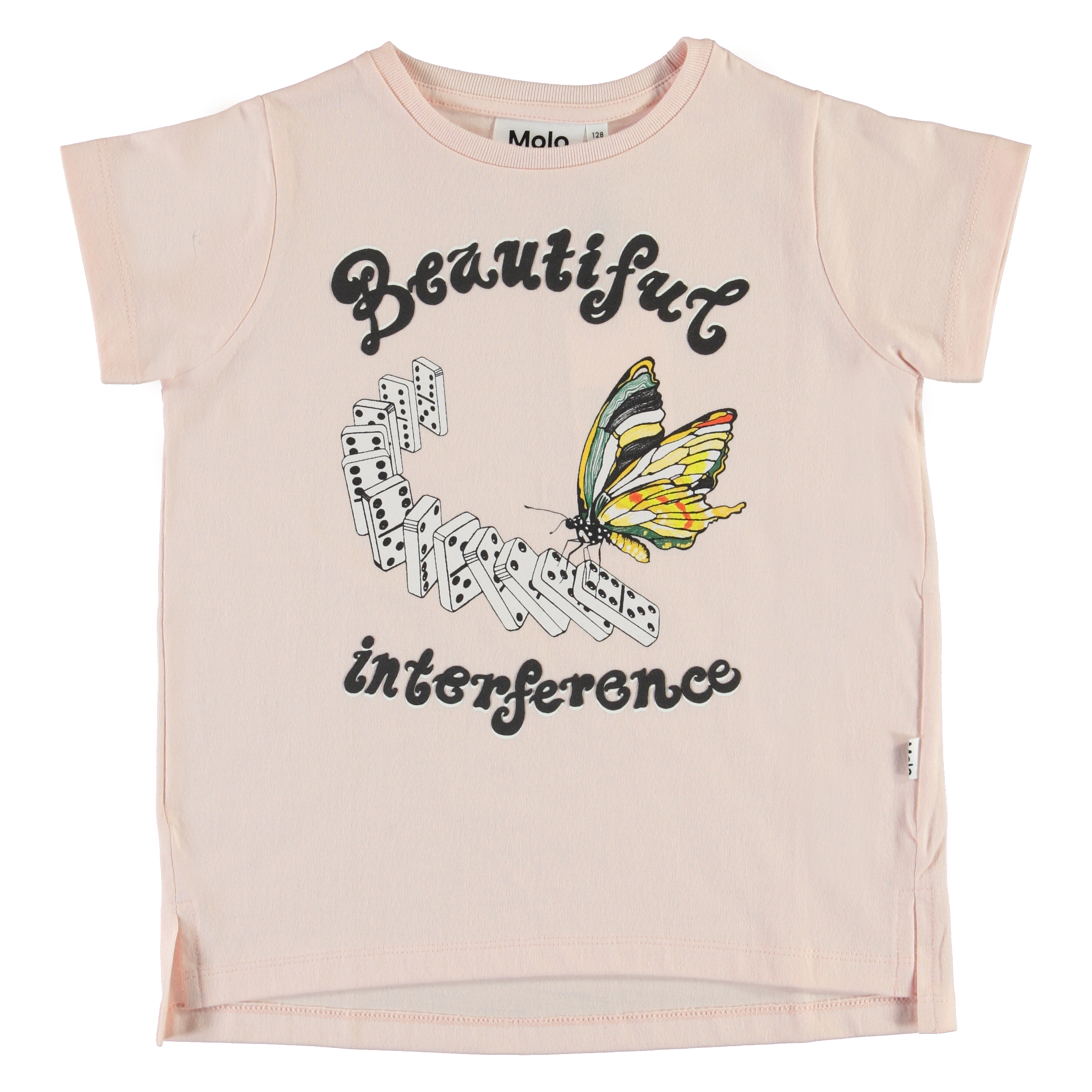 Reenasa er en rosa t-shirt med print af sommerfugl og domino brikker på fronten og teksten 'Beautiful interference'. T-shirten er en smule længere bagtil og har små slidser i siderne.