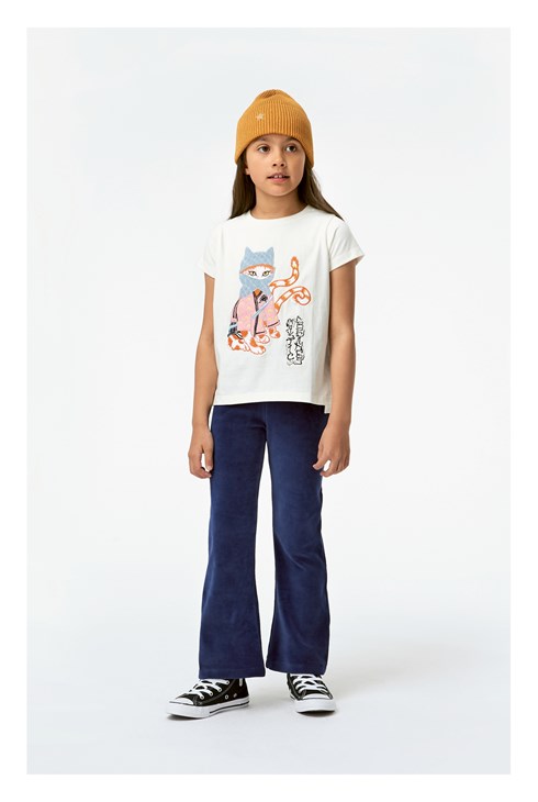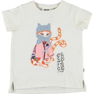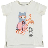Reenasa er en hvid t-shirt med print af en ninja kat på fronten. T-shirten er en smule længere bagtil og har små slidser i siderne.