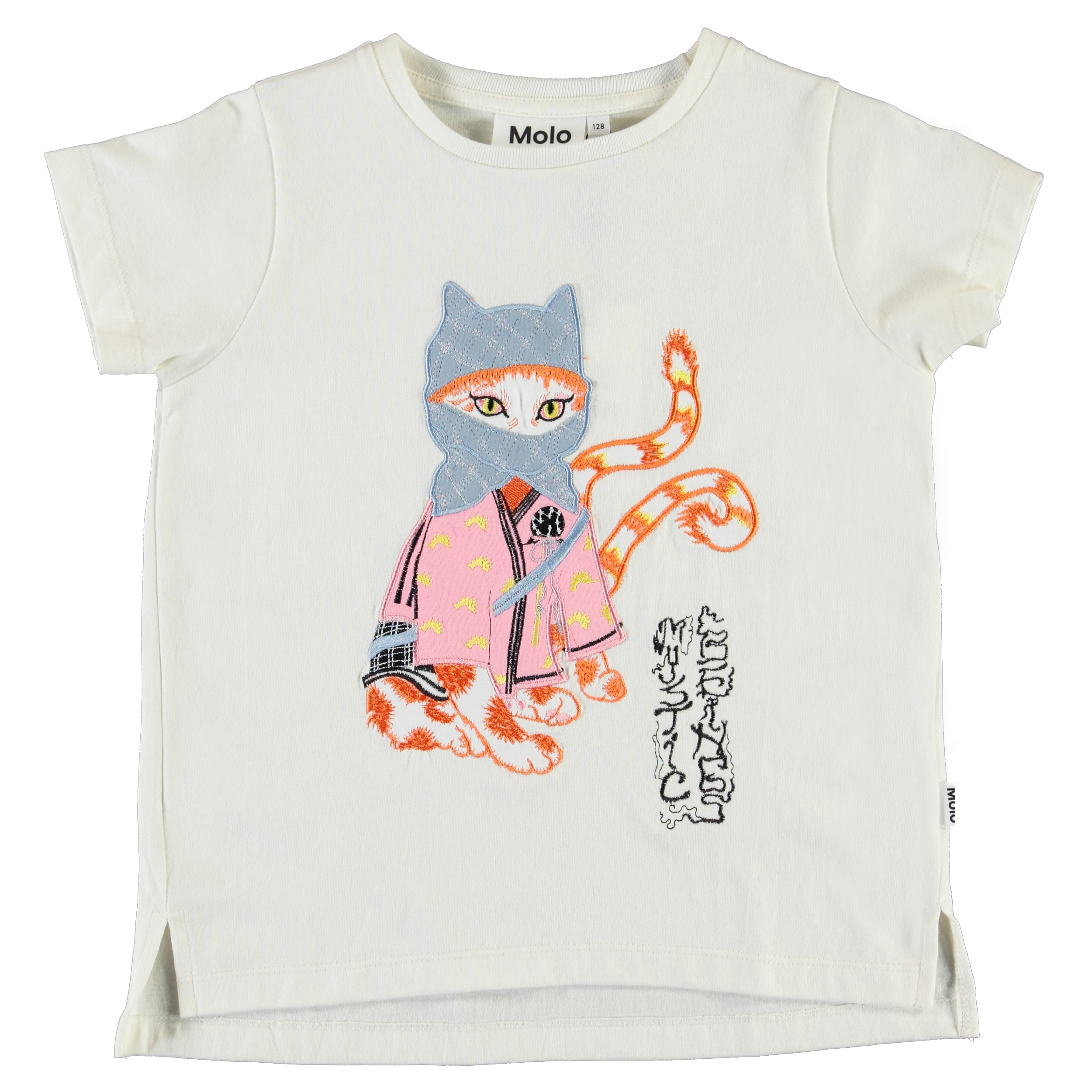 Reenasa er en hvid t-shirt med print af en ninja kat på fronten. T-shirten er en smule længere bagtil og har små slidser i siderne.