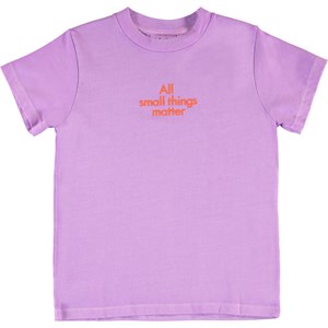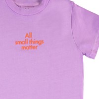 Reeve er en lilla t-shirt med teksten 'All small things matter' på fronten.