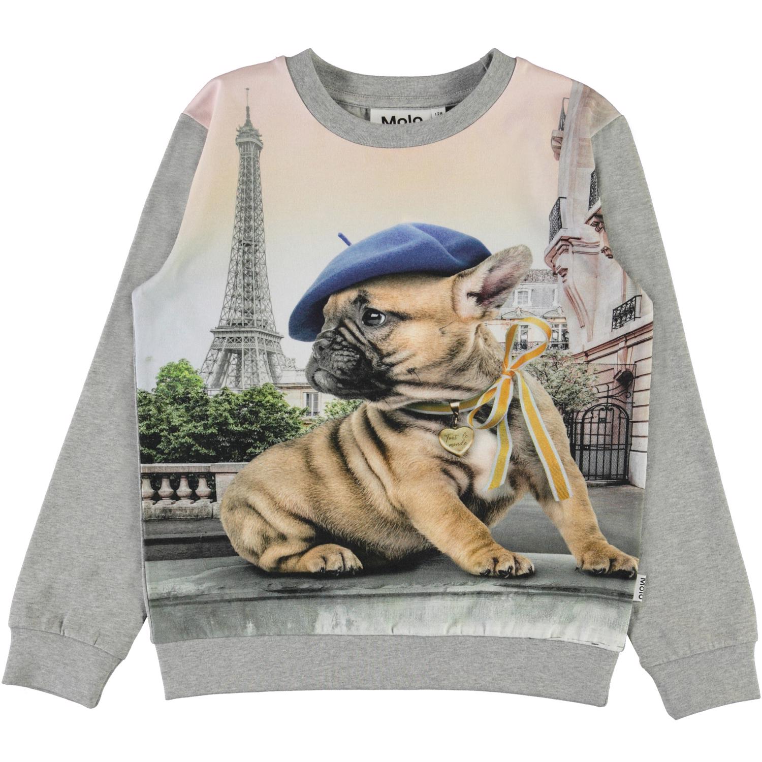 Regine er en grå bluse med print af en fransk bulldog med sløjfe om halsen og beret på hovedet. I baggrunden af printet er Eifeltårnet. Certificeret af Ecocert Greenlife, certifikationsnr. 197496.