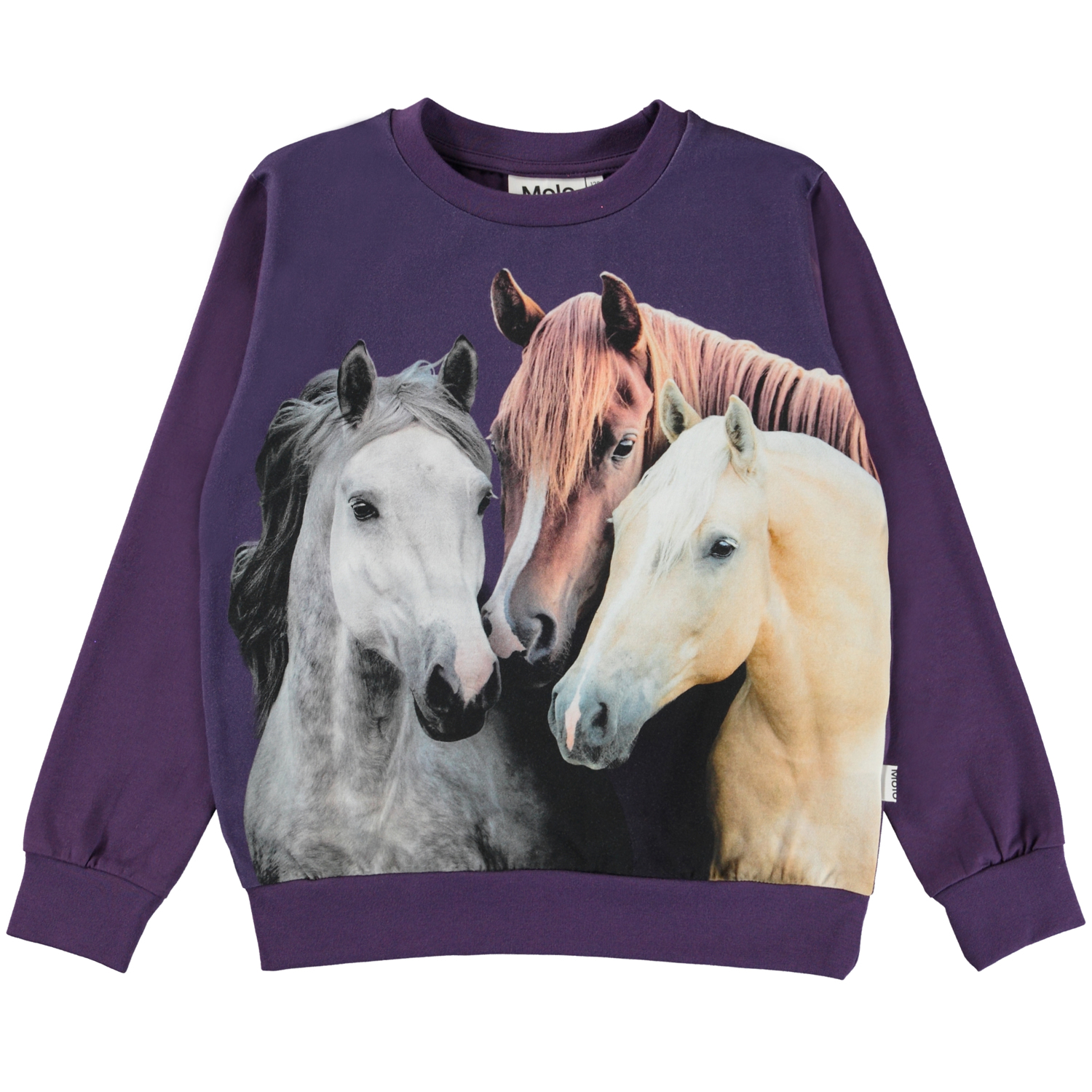 Regine er en lilla bluse med print af tre heste i forskellige farver på fronten af blusen.