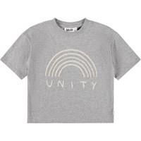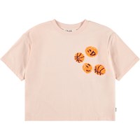 Lyserød t-shirt i blød, økologisk bomuld med rund hals og ribkant. T-shirten har en løs pasform og ærmer, der falder blødt over skuldrene, med små orange pailletbasketbolde på brystet.
