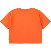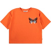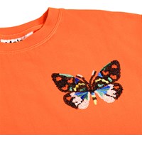 Rød t-shirt i blød, økologisk bomuld med rund hals og ribkant. T-shirten har en løs pasform og ærmer, der falder blødt over skuldrene, med en farverig paillet sommerfugl på brystet.