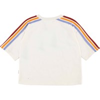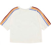 Reinette er en hvid t-shirt med flotte farverige striber på ærmerne. T-shirten har lange og brede ærmer, samt en rund halsudskæring.