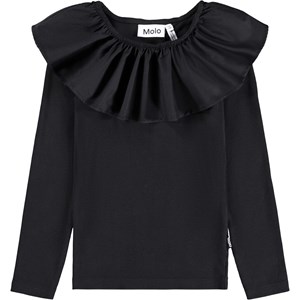 Sort, tætsiddende langærmet bluse i økologisk bomuldsrib med poplinkrave og elastik, der kan bæres off-shoulder eller løftes op for at fungere som både krave og ærme.