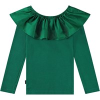 Flaskegrøn, tætsiddende langærmet bluse i økologisk bomuldsrib med poplinkrave og elastik, der kan bæres off-shoulder eller løftes op for at fungere som både krave og ærme.
