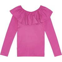 Mørk pink, tætsiddende langærmet bluse i økologisk bomuldsrib med poplinkrave og elastik, der kan bæres off-shoulder eller løftes op for at fungere som både krave og ærme.