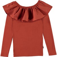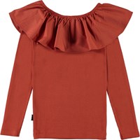 Renate er en langærmet bluse i brændt rød . Blusen er i rib kvalitet med stor flæsekrave, som enten kan sidde oppe på skuldrene eller kan hives lidt ned, så skuldrene er frie.