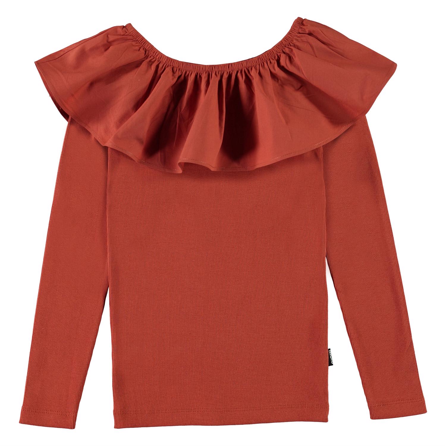 Renate er en langærmet bluse i brændt rød . Blusen er i rib kvalitet med stor flæsekrave, som enten kan sidde oppe på skuldrene eller kan hives lidt ned, så skuldrene er frie.