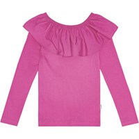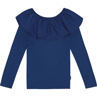Turkisblå, tætsiddende langærmet bluse i økologisk bomuldsrib med poplinkrave og elastik, der kan bæres off-shoulder eller løftes op for at fungere som både krave og ærme.