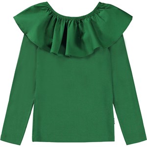 Grøn langærmet top med poplinkrave. Poplinkraven er med elastik, og kan både placeres off-shoulder eller placeres oppe, så den fungerer som både krave og ærme.