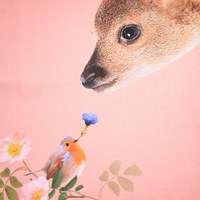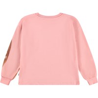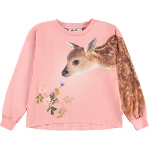 Lyserød langærmet bluse i blødt økologisk bomuld med ribkant i ærmer og hals. Blusen har en løs pasform og går længere ned bagpå. Blusen har et print af et dådyr og en lille fulg der møder hinanden.