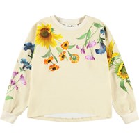 Sort bluse i blød, økologisk bomuld med rund hals og ribkanter ved ærmer og hals. Blusen har en løs pasform, er længere bagtil med et legende print af en hund og en kat, i blomsterregn.