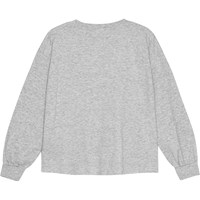 Gråmeleret langærmet bluse i økologisk bomuld med løs pasform, rund halsudskæring og ribkanter. Blusen er længere bagtil end foran. Printet forestiller killinger i sportstøj omringet af bolde med et budskab om, hvordan sport og leg kan berige vores venskaber og relationer.