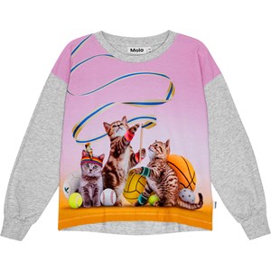 Gråmeleret langærmet bluse i økologisk bomuld med løs pasform, rund halsudskæring og ribkanter. Blusen er længere bagtil end foran. Printet forestiller killinger i sportstøj omringet af bolde med et budskab om, hvordan sport og leg kan berige vores venskaber og relationer.
