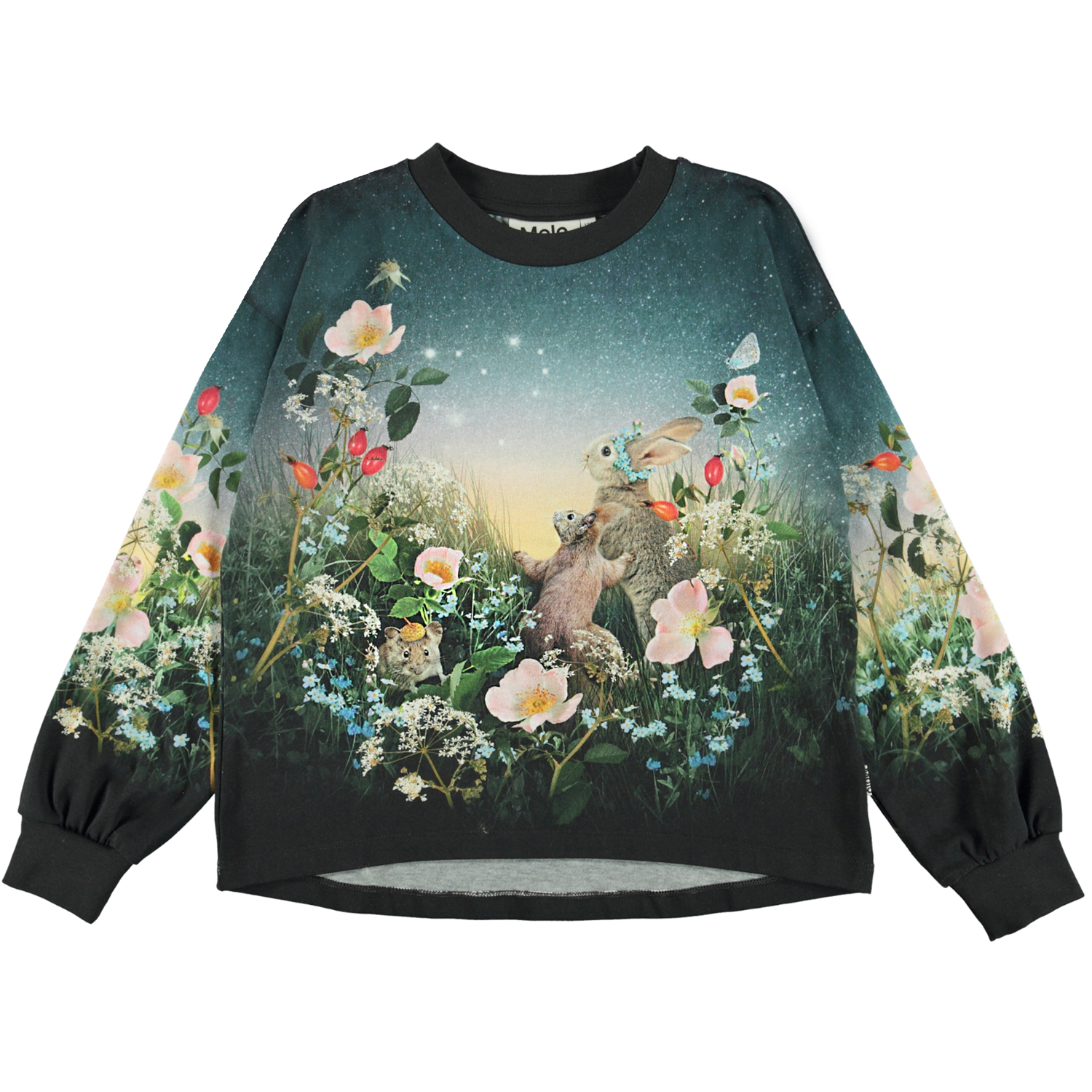 Reniza er en mørk bluse med print af blomster og to kaniner, som kigger op på stjernehimlen. Blusen har en smule mere længde bagtil.