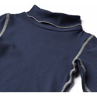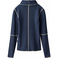 Mørkeblå, langærmet bluse i strækbar, blød viskose med tætsiddende pasform, rullekrave, rå kanter og synlige, råhvide syninger.
