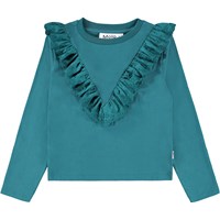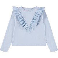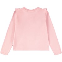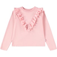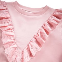Lyserød, langærmet bluse i økologisk bomuld med rund hals og ribkant. Blusen har en normal pasform og er pyntet med en flæsekant af broderi anglaise, der løber ned i en V-form både foran og bagpå.