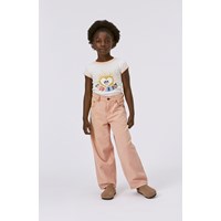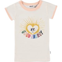 Hvid t-shirt med lyserøde ryserøde ribkanter og et placeret frontprint. af et hjerte, der stråler som solen, og spreder budskabet om "Good Energy". Denne t-shirt er fremstillet i 100% bomuld, har korte ærmer, en rund halsudskæring, ribkant ved hals og ærmer, samt et slim fit.