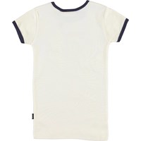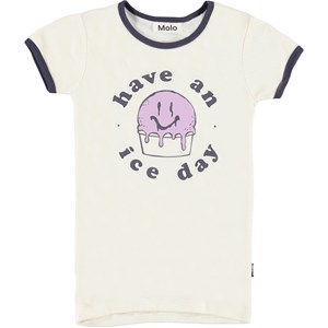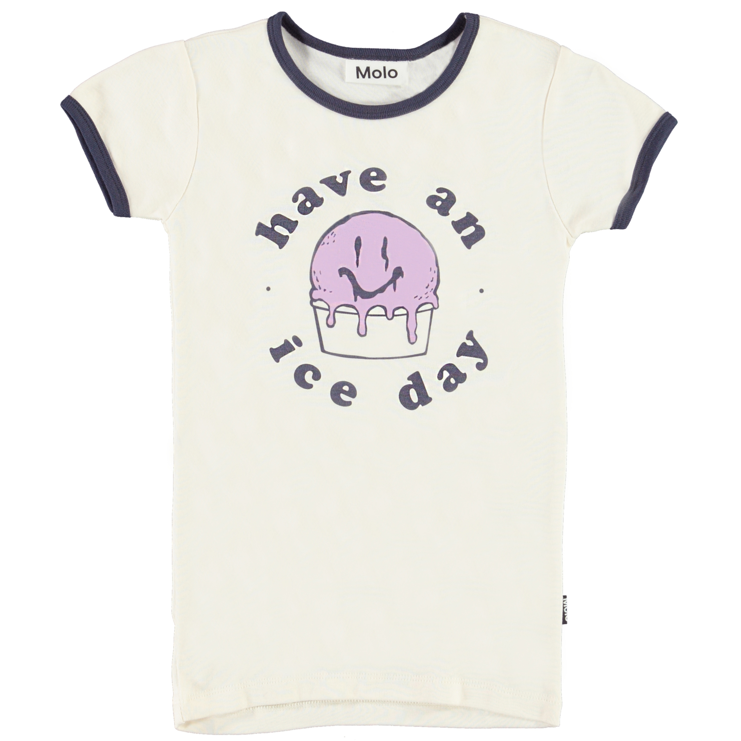 Rhiannon er en ringer t-shirt i hvid med mørkeblå kantbånd. På fronten af t-shirten er der print af en is med et smiley ansigt.